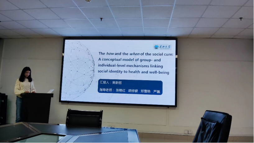 吴新丽同学从问题提出、研究假设、理论框架和研究意义等方面对文献进行了汇报。她首先提出大量研究表明,社交网络和社会身份对身心健康有着深远的影响;其次,研究证据显示社会关系在保护心理健康方面的重要性,我们当前面临的挑战是解释出现这种情况的原因;第三,本篇文章的主要内容是从社会认同对健康和幸福感的积极影响出发,通过介绍社会认同的三个不同方面:个体认同、群体认同个体感知的群体认同,来区分社会认同在群体层面和个体层面以及群体和个体层面相互作用的“社会治疗”机制,作者根据前人实证研究提出了3个理论模型,5个命题,强调了群体层面效应及过程的重要性及群体层面与个体层面相互依赖关系;最后,作者整理了社会认同在健康和幸福感领域的理论框架及研究意义,并指出后续科学研究扩展可能方向。