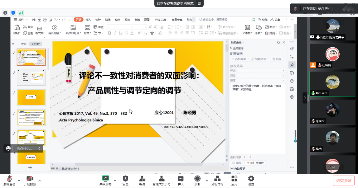 会议正式开始,首先由陈晓男同学进行文献汇报,题目为《评论不一致性对消费者的双面影响:产品属性与调节定向的调节》,该文章于2017年发表在《心理学报》,本研究基于调节定向理论, 通过引入评论中的产品属性内容来探究消费者评论不一致性所造成的双面影响,力图揭示产品属性评论不一致性会产生不同的影响机制, 解决已有研究中关于评论不一致性看似冲突的结论。研究结果表明:评论不一致性会通过影响消费者对产品的风险和独特性感知进而影响其购买意向;垂直属性评论(水平属性)不一致性越高, 越会激发消费者的风险感知(独特性感知),进而降低(提高)购买意向; 并且消费者调节定向对产品属性的调节作用会进一步调节。