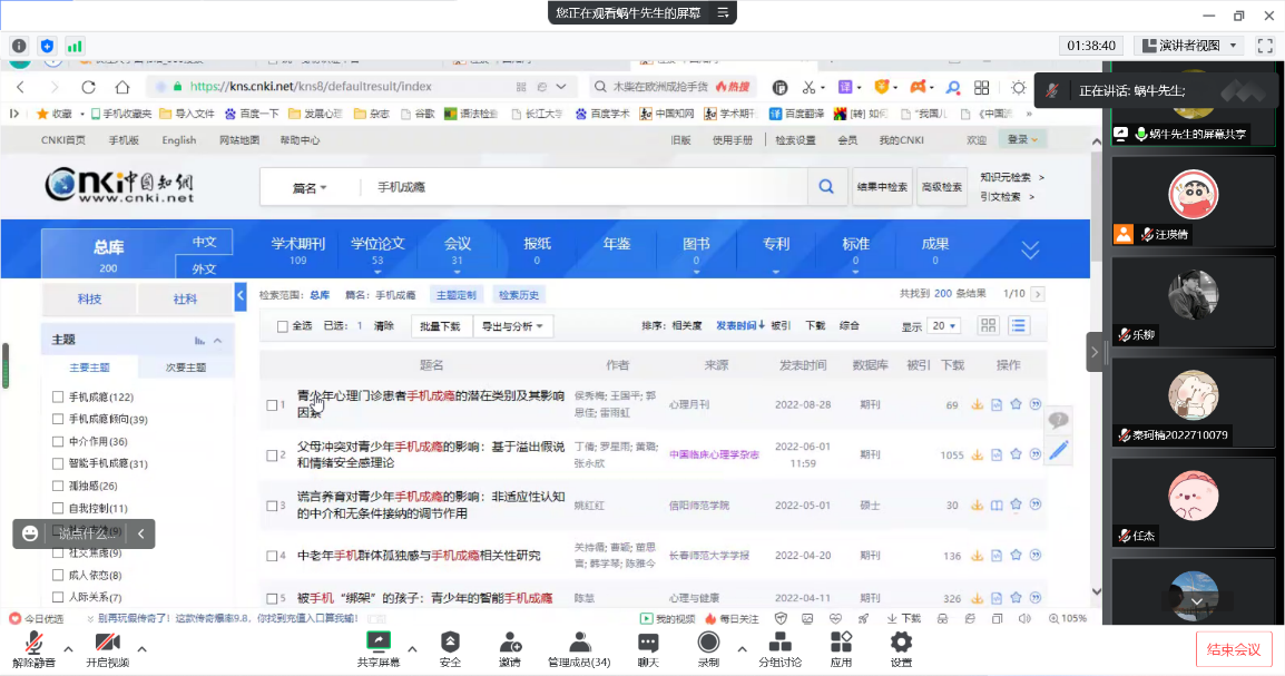 (通讯员 汪瑛倩)20221009日晚7点,第53期青少年网络心理与行为专题例会在线上召开。此次例会共30余人,包括硕士生导师连帅磊老师和课题组的研究生,以及部分本科生。本次会议由陈晓男同学汇报文献,连帅磊老师讲解文献查阅方法,由汪瑛倩同学负责本次的会议记录。