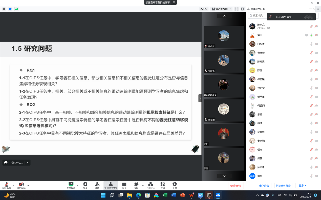 202210月16日晚7点,第54期青少年网络心理与行为专题例会在线上召开。此次例会共30余人,包括硕士生导师朱晓伟老师,连帅雷老师和课题组的研究生,以及部分本科生。本次会议由黄贝和黎慧婷同学汇报文献,由陈孝文同学负责本次的会议记录。