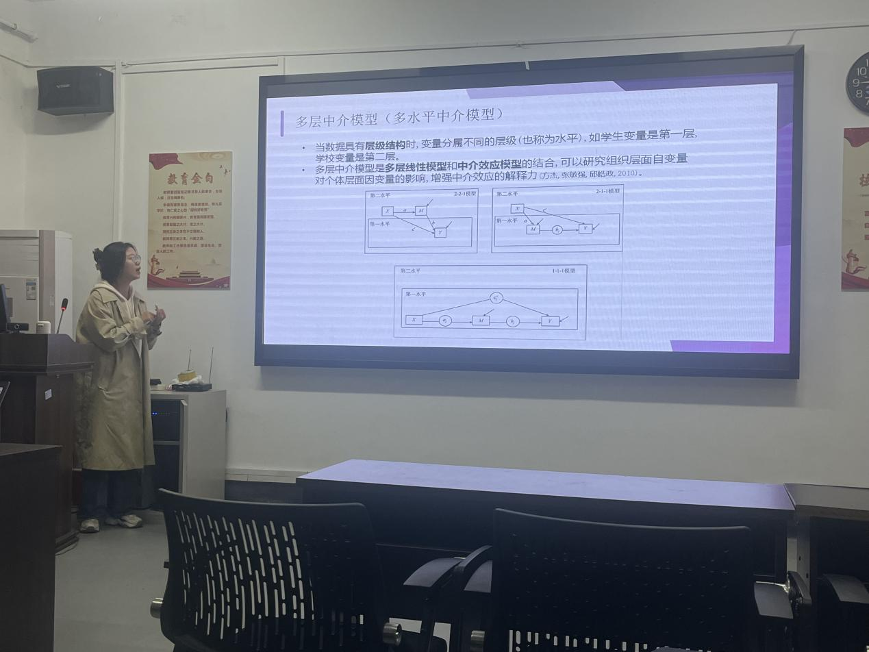 首先夏领域学给我们分享2019年发布在《Journal of Happiness Studies》杂志上的一篇文献,文章的题目是《Hope as Mediator Between Teacher–Student Relationships and Life Satisfaction Among Chinese Adolescents: A Between-and Within Person Efects Analysis》,文章是从纵向角度进行研究,夏领域同学从六个方面进行汇报。首先进行知识补充,介绍该篇文献采用的新的纵向设计研究方法:多层中介模型,讲解了该模型的原理、检验它的mplus语法以及插件MLmed。紧接着进入文章内容讲解,秦珂楠同学从引言到结果讨论一一进行剖析。在汇报尾声,提出自己的收获和思考。汇报过后,连帅磊老师该模型和插件进行补充说明。随后张泽同学、曹晓萱同学、吴欣格同学以及本科生同学提出了自己的疑问,连帅磊老师、朱晓伟老师对同学提出的问题进行了回答。最后,各位老师对文章进行讨论,朱晓伟老师对组内同学提出要求,建议同学们应该用数据进行实操。