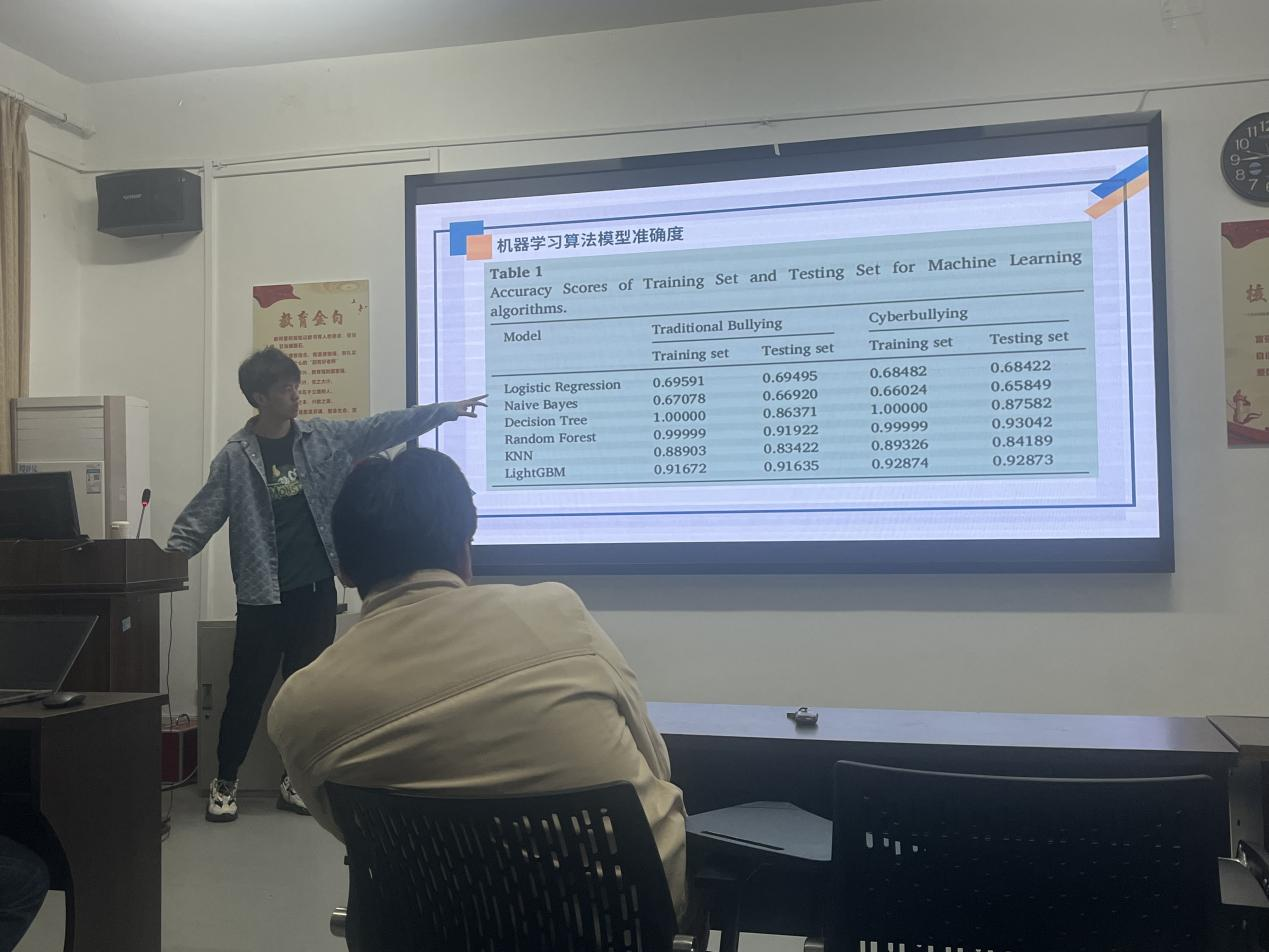 紧接着,蒲俊伟同学汇报了清华大学心理学团队发表的Detecting the risk of bullying victimization among adolescents:A large-scale machine learning approach》。该文章内容简洁明了,逻辑思路清晰,利用大数据机器学习方法检测青少年的欺凌受害风险 。蒲俊伟同学从研究背景、研究工具与方法、研究结果与讨论四个方面进行汇报,对文章中出现的概念、使用的方法进行讲解,带领大家看文章中的图表和数据。汇报结束后,秦珂楠同学提出存在多种机器学习方法,是否需要对每一种方法进行检测,老师们帮助理解和解答。朱晓伟老师提出疑问。当数据较少时该方法是否适用。最后,朱晓伟老师认为这种方法对实验基础要求较高,现阶段我们可以进行了解,开开眼界,建议大家在每周汇报之间都看看文献,一起学习一起进步,希望大家都可以从每周汇报中学到新的东西。