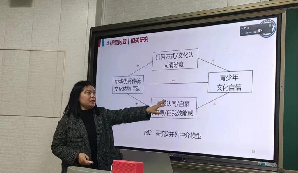 在交流讨论环节,李予慧同学就韩淼同学汇报中的青少年文化自信三系统影响机制动态模型提出疑问,汇报人认真解答,解决了李予慧同学的疑问。