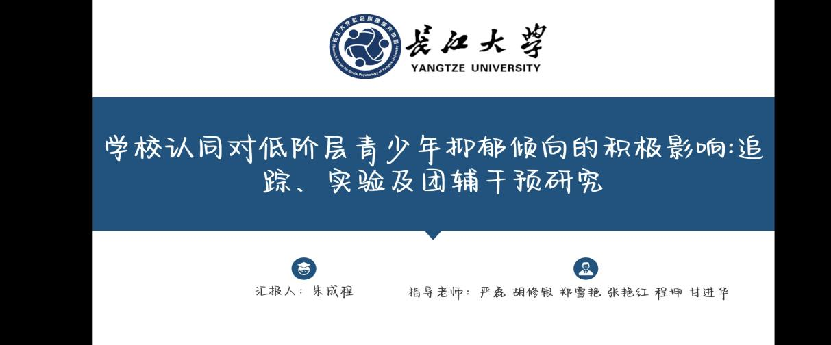 接着是朱成程同学的汇报,从研究背景、研究方法和过程、后续工作安排三个方面来展开,从社会认同视角出发,探讨学校认同对低阶层青少年抑郁的积极作用。研究一使用追踪设计,探讨学校认同对对低阶层青少年抑郁的积极效应;研究二使用失败任务范式,考察学校认同是否可以缓解消极情绪;研究三,设计团辅干预,通过提高学认同降低阶层青少年的抑郁倾向。