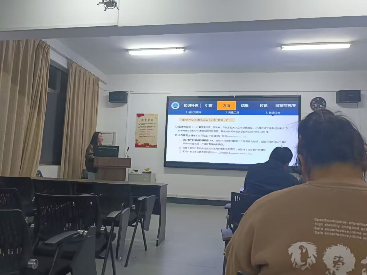 紧接着,秦珂楠同学汇报了在Journal of Youth and Adolescence上发表的《Patterns and Transitions of Nonsuicidal Self-njury Outcome Expectancies and Their Associations with Nonsuicidal Self-Injury among Adolescents》。该文章虽然比较复杂,但是秦珂楠同学以清晰的逻辑思路带领我们学习了NSSI结果预期的模式和转变。秦珂楠同学从知识补充、引言、方法、结果、讨论、收获与思考六个方面进行汇报,对文章中出现的概念、使用的方法进行讲解,带领大家看文章中的图表和数据。共同学习了以个体为中心的统计方法(LCA和LPA)及其在纵向设计中的延伸和应用,即(RI-)LTA,并且加深了对于随机截距的理解。朱晓伟老师赞扬秦珂楠同学汇报的非常到位,希望大家都可以从每周汇报中学到新的东西。