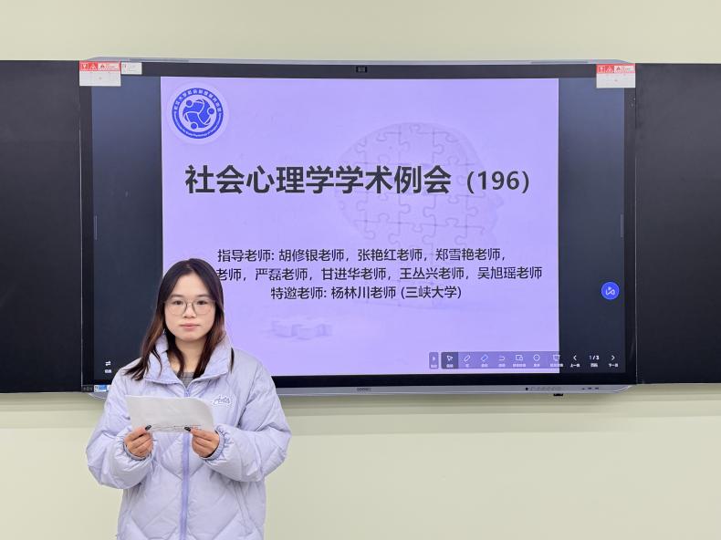 (通讯员:唐可心)2025年11月18日19:00至21:00,第196期社会心理学学术例会在长江大学东校区16教A104室如期举行。本次例会采取线上线下相结合的形式,由本科生科研助理袁芯丽同学主持,主题为“文献分享汇报”。参加本次例会的老师有甘进华老师、吴旭瑶老师和杨林川老师(三峡大学),学生有9位心理学研究生,16位本科生科研助理。