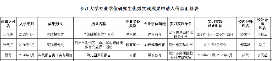 为强化专业学位研究生实践创新能力培养,深化专业学位研究生培养模式改革,提高专业学位研究生培养质量,根据《关于开展“2021年长江大学专业学位研究生优秀实践成果”评选工作的通知》的要求,经过学生个人申报、学院学术委员会评审。结果如下: