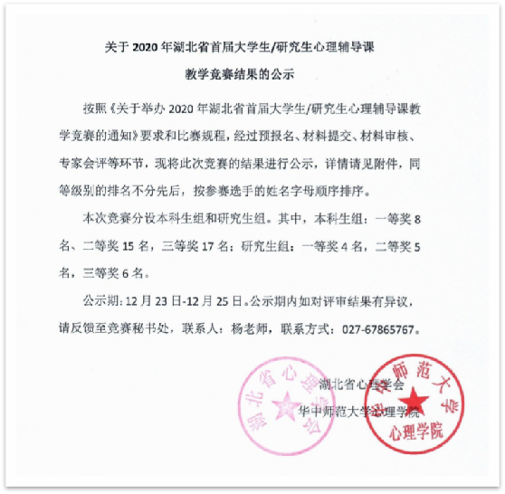 (通讯员:严磊)近日,2020年湖北省心理辅导教学竞赛专家评审传来喜讯,我院心理学系郑雪艳副教授、朱晓伟副教授和甘雄博士指导的3位参赛学生获奖,其中,二等奖两项、三等奖1项。