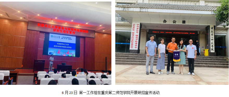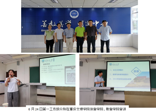 第一工作组由副院长杜光友带队,研究生导师宋永晶副教授及心理系主任朱晓伟博士一行3人,于6月22日至25日前往西南线的长江师范学院、重庆第二师范学院、重庆文理学院、内江师范学院4所高校开展研招宣传活动。第一工作组分别在长江师范学院体育与健康科学学院、重庆第二师范学院教育教师学院、重庆文理学院体育教育学院、内江师范学院的体育学院(教育学院学生亦一并参会)开展招生宣讲活动。招生宣传现场气氛热烈,学生们报考我院意愿强烈。
