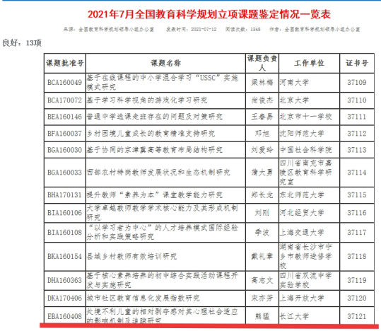 熊猛副教授主持的全国教育科学规划项目“处境不利儿童的相对剥夺感对其心理社会适应的影响机制及追踪研究”顺利结项,获评“良好”等级。全国教育科学规划项目此次结项“良好”仅13 项。