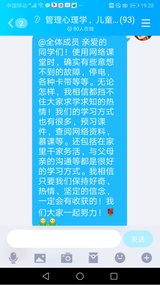 通过两周的网络教学,很多学生纷纷通过微信和qq给郑老师留言,“网络学习拉进了老师和同学的关系”,“有老师您在真好”,“也促进了自学能力的增强,心情也变好了。”郑老师也对同学们说:“我相信只要我们大家共同努力,一切都会好起来的。冬天已经过去,春天已经来临,待到春暖花开时节我们一定会胜利会师!重返我们美丽迷人的长江大学。”