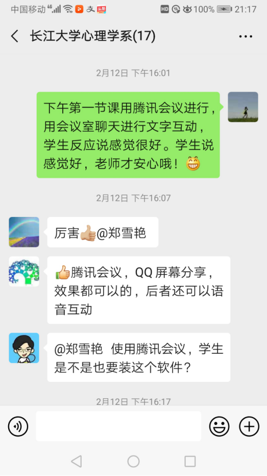 面对新的教学形式,虽然做了很多的准备,但老师们心里还是有些许忐忑,学院和系部领导非常重视老师们的诉求,要求各系部成立课程小组,根据教务处通知要求制定网络教学基本规范,系主任带领老师们讨论网络教学中可能遇到的困难和问题,商量解决的办法和措施。为了保证教学效果,郑老师虽然做了充分的准备,但郑老师仍然担心出现意想不到的故障,她把自己的担忧与学院和系部的领导及老师进行交流,同事们一边鼓励她,一边把自己授课的经验,自己在家里存储的资料与她分享,学院领导多次关心自己的健康和教学,这些都给了郑老师无尽的温暖和鼓励。每次课程结束后她都会与远方的同事们讨论哪些授课软件的效果好,讨论其他的同事们在授课中有什么好的经验和做法,让同事们帮忙在家寻找网上查不到的教材内容和资料。在这个暖心的团队里,郑雪艳老师感受到了集体的力量和温暖。