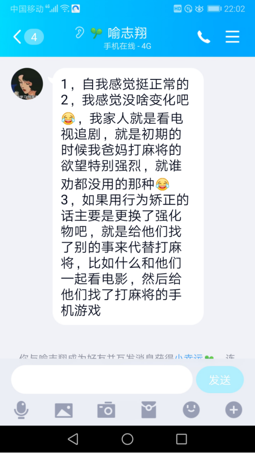在教学过程中郑老师不仅注重学生对理论知识的掌握,更是充分发挥了课堂思政的作用,同时也对处于特殊时期的学生及时运用专业知识进行心理疏导。在网络教学过程中,郑老师要求同学们在听课前准备好笔和笔记本,坐在电脑前或者拿出手机放在桌上听课,这样便于集中注意力。促进同学们养成良好的学习习惯,在《儿童行为矫正》课中,鼓励同学们运用学到的知识点,对自己的良好行为进行强化,鼓励同学们运用专业知识帮助自己、家人和朋友。在授课过程中,有些同学有些焦虑、恐惧、悲伤等情绪,问到什么时候可以回学校,有些同学在家里呆久了烦躁无聊,有些同学每天过度关注疫情信息,甚至导致了替代性创伤,郑老师在课堂教学中结合案例,运用心理学知识安抚同学们情绪,帮助同学们客观分析各种信息,学会接纳,学会反思,学会沟通。让每个同学问问自己,“我在这场防疫战斗中,我的专业能为防控做点什么?”“我能做出什么贡献?”。