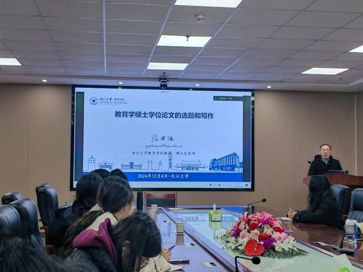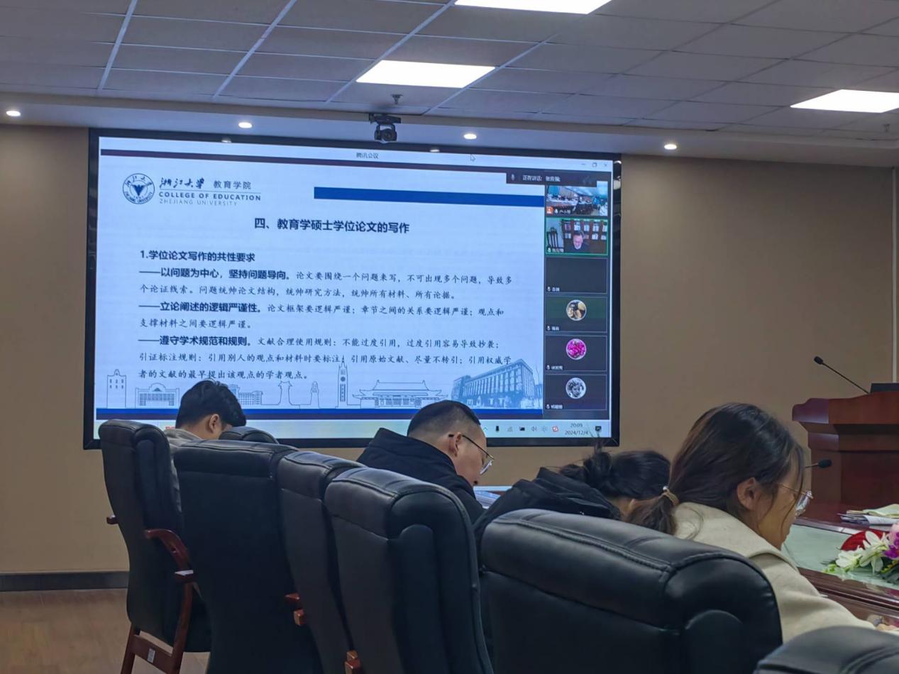 为了强化我院研究生导师培养,提升导师岗位胜任力,全面提高研究生培养质量,尤其是学位论文质量。2024年12月4日晚,我院在文科大楼905会议室举行本学期第二场导师培训,本次特邀浙江大学张应强教授进行线上讲座,讲座主题为《教育学硕士学位论文的选题和写作》,我院教育学专业全体研究生导师参会,培训会由熊猛副院长主持。