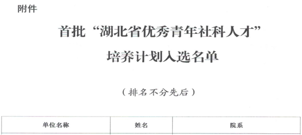 据了解,经过省社科联组织专家综合评审,本次入选的教师均为40周岁以下、具有博士学位和副高及以上职称,且获得过省部级社科优秀成果奖或承担国家社科基金项目的湖北省内优秀青年社科人才。