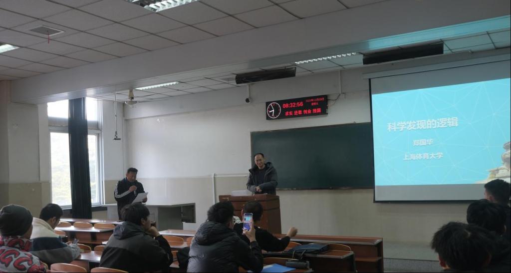 (通讯员:张泽)12月8日上午,我院在12教203举行了“长大20年”学术论坛暨长江教育与体育讲坛(2023年第10讲)。本次讲坛特邀上海体育大学郑国华教授作为主讲,讲座题目为《科学发现的逻辑》。参加本次讲座的有副院长宋永晶副教授、研究生教学秘书卢小琴老师,体育方向的三十余名研究生及部分其他学院师生。教体学院杜光友副院长主持了本次活动。