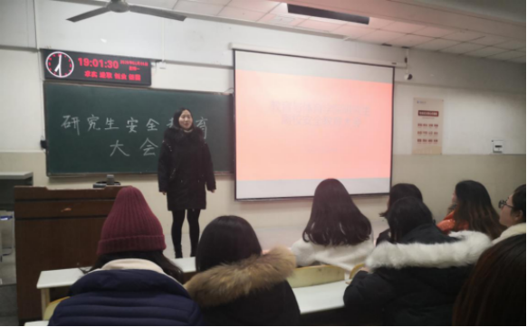 (通讯员 苏春来)为了学生安全着想,1月6日晚7时许,我院在12教104教室举办了研究生“寒假安全教育大会”。此次与会的人员有辅导员任雯婷以及全体研究生,主讲人为邵倩。