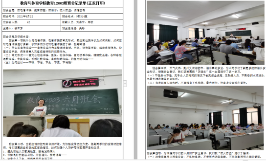 会上各班主任对即将到来的期末考试、暑期离校(留校)安排以及暑期安全防范教育做了详细说明。在考试考风教育方面,结合《长江大学学生违纪处分办法》,提醒学生遵守考场规则,服从考试工作人员的安排与要求,再次强调了考试的违纪行为及其处罚措施;在关于学生暑期离校(留校)方面,强调了原则上非必要不留校,分别对离校、留校以及留荆不留校的三类学生管理进行了说明,比如留校同学需每天定时定点打卡签到,留荆同学需个人申请,附家长知情同意书等,要求所有学生签订《暑期安全责任告知书》和《离校登记表》;在暑期安全防范教育方面,结合近期发生的相关案例,对于学生假期前后的防诈骗、防溺水、防火防盗以及疫情防控等进行了提醒和强调。