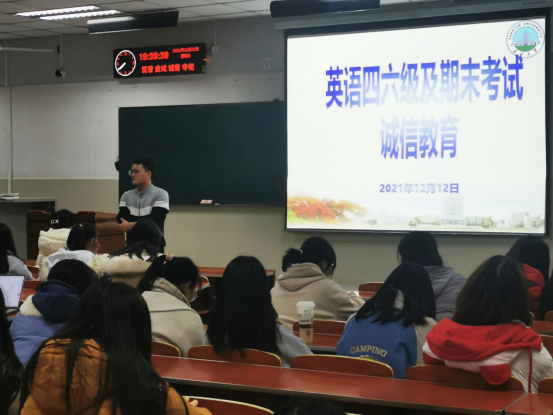 临近期末,英语四六级、研究生入学以及期末考试接踵而至,考试不仅是对学生学习情况的评价,更是对学生诚信品质的检验,为了号召全体同学诚信应考,杜绝舞弊,净化考场环境,树立良好学风,我院于2021年12月12日至20日,以班级为单位组织学生召开了诚信考试主题教育大会。