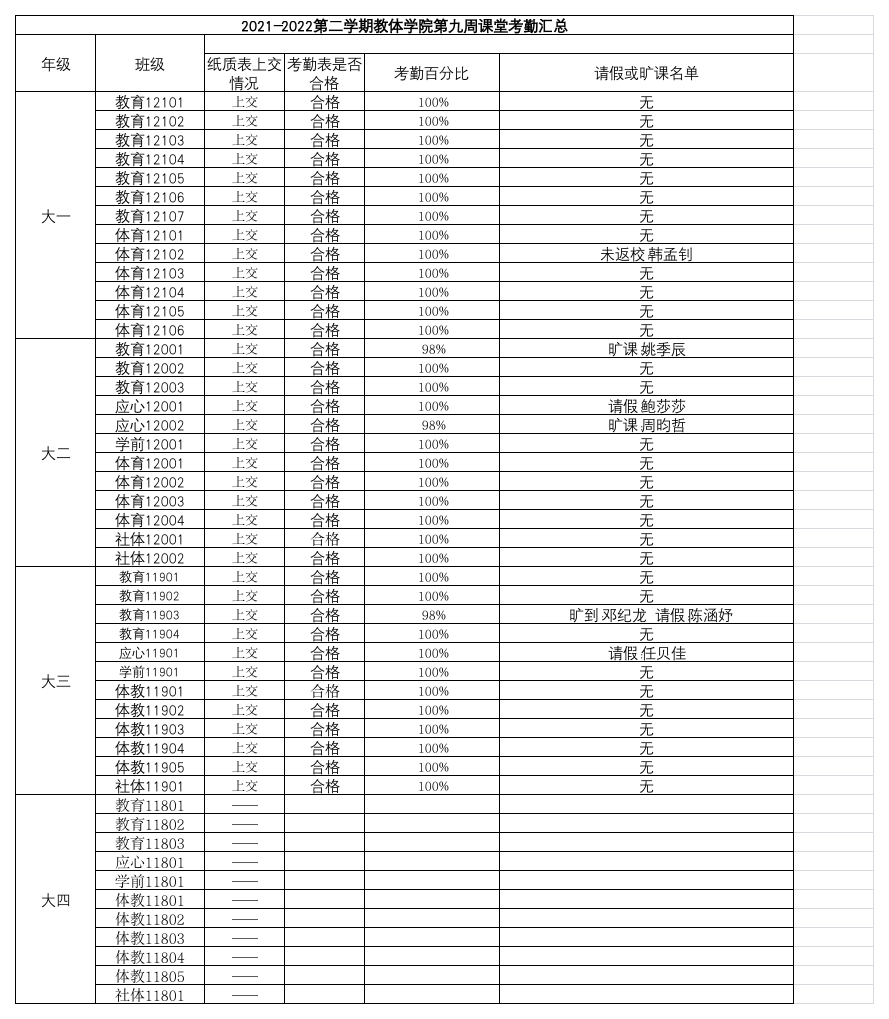 2021-2022年第二学期教体学院第九周课堂考勤汇总
