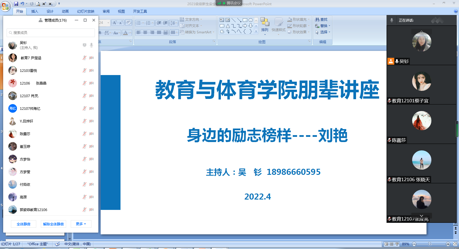 (通讯员 徐坤 李梦瑶)4月21日下午,长江大学2022年304永利集团登录入口朋辈系列讲座第一讲《身边的励志榜样》顺利开讲。此次讲座由教育学院辅导员吴钐老师主持,体育系学生刘艳同学主讲,304永利集团登录入口全体2021级成员参加,借助腾讯会议线上平台进行。