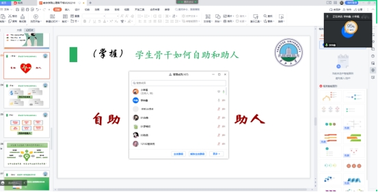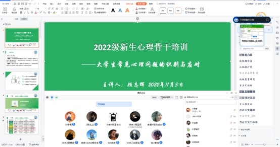(通讯员:李璐何烨)为加强心理骨干对工作的认知,调动心理骨干工作积极性,帮助同学们保持积极阳光的心态,2022年11月3日下午四点,304永利集团登录入口心育部开展了线上心理骨干培训讲座。本次培训由辅导员顾志辉老师担任主讲人,教体学院22级全体心理骨干参加此次会议。