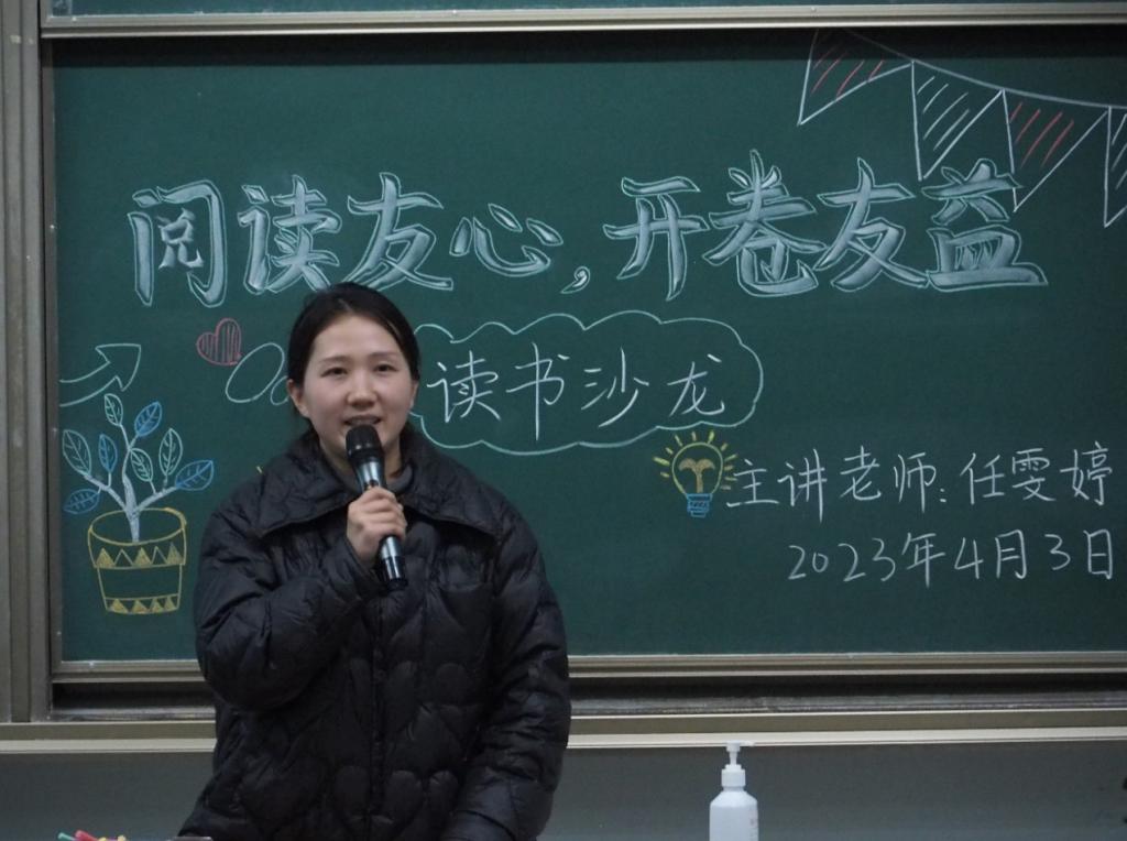 接着,任雯婷老师进行了“阅读沙龙”活动的动员。任老师为我们仔细介绍了“阅读友心,开卷友益”阅读系列活动,分别有读书征文活动、阅读座谈会和读书汇报活动,目前都即将开展。这些活动是为丰富同学们的课余生活而精心筹划,不仅帮助同学们培养阅读习惯,收获精神食粮,也为大家提供一个自我展示的机会与平台。另外,任老师也鼓励大家多多参与,开卷有益。希望大家参加活动收获到的不仅是丰厚的奖品,更是阅读的一份初心与美好。