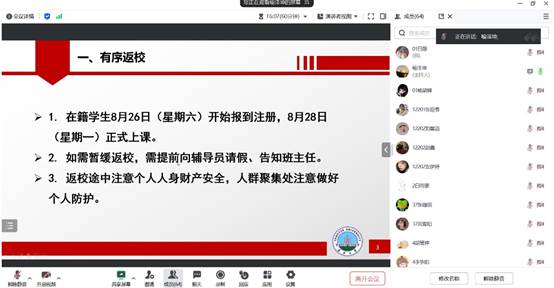 会上,各年级辅导员和班主任就秋季开学学生返校的时间、返校条件以及相关注意事项做了说明。同时,向同学们强调返校后的教学活动要求,提醒同学们按时上下课,调整好返校后的心态,及时投入到学习活动中,做好个人目标规划。