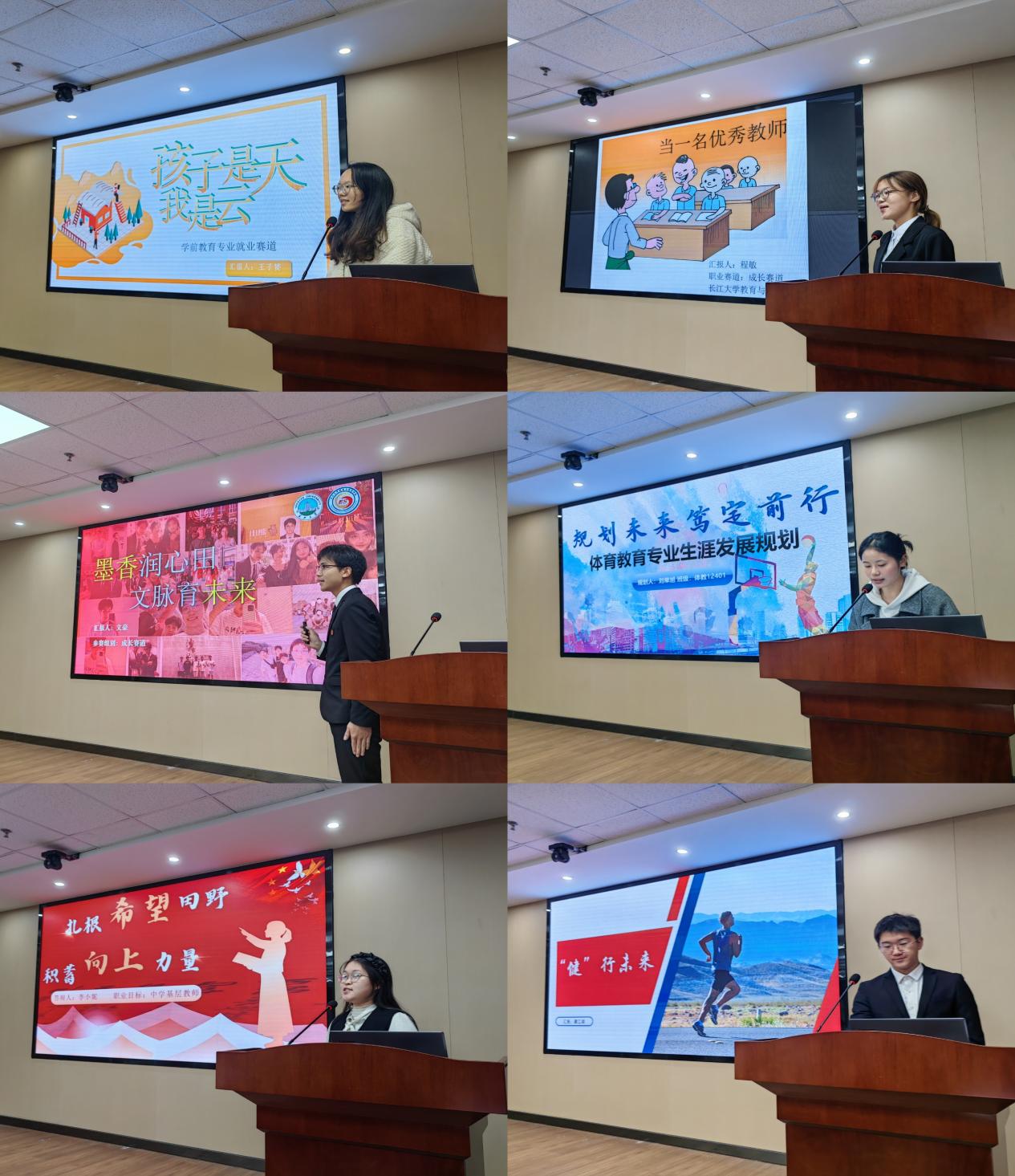 大赛伊始,主持人瞿廷婷介绍了本次大赛的评委老师,讲解了评分标准,并明确了大赛纪律,确保比赛顺利进行。随后,进入到紧张激烈的答辩环节。本次就业赛道和成长赛道共有23名选手,他们结合兴趣、专业、国家政策等,确立自己的职业生涯目标,通过精美的PPT,配合自信激情的演讲,描绘出各自独特的职业蓝图,展现出对未来发展的憧憬。选手们表示,他们将把握学习机会,拿出求知热情,为实现生涯目标而奋斗。他们对自我的精准认知、对职业环境的深入探索、对实施步骤的详细规划以及对可能变化的合理评估,彰显出教体学院学子积极向上、勇于探索的精神风貌。