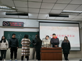 大会第三项,进行2019年新发展团员入团仪式。首先邀请本次嘉宾任雯婷老师为新团员颁发团员证,紧接着由组织部骆阳同学带领新团员宣誓,使新团员意识到身为优秀共青团一员的责任所在。随后再次邀请任雯婷老师代表上级团组织进行发言。在一番问候与祝贺后,任雯婷老师从思想、工作、学习三方面对新团员提出要求,最后对所有团员提出“处处发挥先锋作用,不负国家不负时代赋予的使命”。全场发出热烈的掌声,对任雯婷老师的发言表示赞叹。