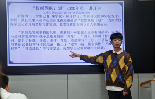 本次培训从前言、基础知识、问题总结、现场修改四个部分对新闻消息写作做出细致阐述。会议伊始,主讲人就“新闻为谁而写” 、“新闻为啥要写” 、“新闻写给谁看”三个问题对新闻写作的官方立场、宣传功能和新闻受众做出讲解。紧接着,主讲人分别对新闻消息稿的构成要素进行讲解,提出“新闻是客观反映,但它不是对客观事物纤毫不遣的复制或‘克隆’“。然后,他结合往届的新闻稿件对不同类型的校园新闻消息进行讲解,提出要根据不同类型新闻的特点做出实时报道。随后,他结合个人经历对诸如“修饰词搭配、称谓选取、标点使用、职位排列”等问题做出解答,强化了参会人员对新闻写作的深刻认识。随后,主讲人对我会近期新闻稿作现场修改,提出新闻稿要讲究细致、注意细节问题;并主张各干事要“多看、多写、多总结”,切实提高个人新闻报道能力。