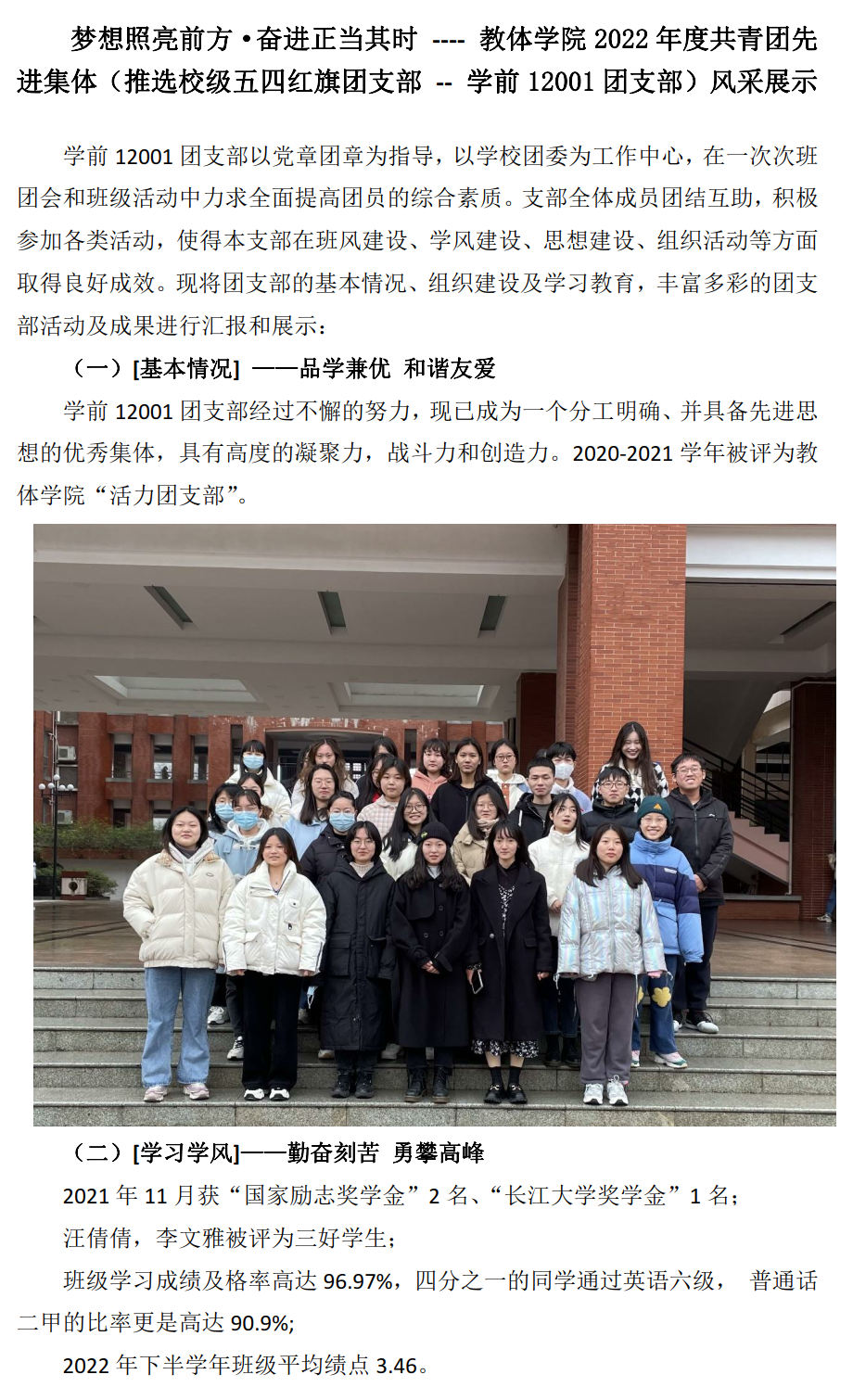 梦想照亮前方·奋进正当其时 ---- 教体学院2022年度共青团先进集体(推选校级五四红旗团支部 -- 学前12001团支部)风采展示