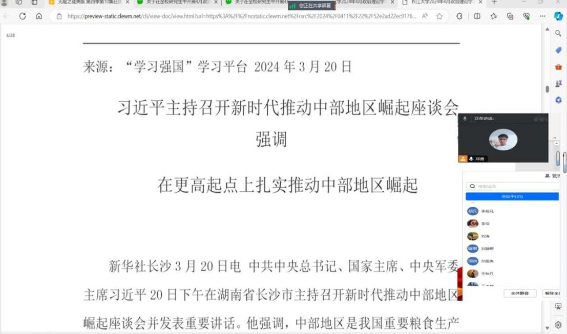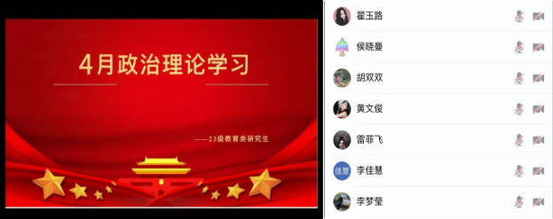 【通讯员 倪梓曦】2024年4月11日至29日,我院全体研究生开展了四月份政治理论学习。各班采用了线上与线下、集体学习与个人自主学习相结合的方式,由团支书进行组织,辅导员陈佳琳老师参与、督促学习。