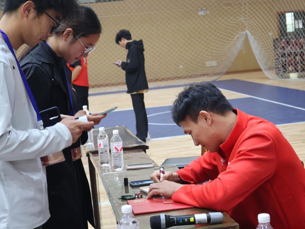接下来,林思宇同学进行了一段精彩的武术表演,动作标准有力,一气呵成,武术表演将现场气氛推到了高潮。在提问环节,同学们从拳击技巧、冠军成长经历、面对大型比赛时的心理状态等方面,进行了提问,文银杭先生耐心地回答了同学们的疑惑,同时也加深了同学们对文银杭先生的了解。随后,教体学院为文银杭先生送上鲜花并颁发“兼职导师”聘书,同时,文银杭也向304永利集团登录入口回赠了他的亲笔签名拳套。紧接着,进入到了签名合影环节,文银杭先生耐心地给现场的同学们签名,并与大家合影留念。