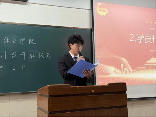 学员代表彭青锋进行发言。他从学生干部本身职责、培训期间纪律要求与珍惜机会,认真学习的承诺三个方面展开。他通过深入细致地阐述了自己对学生干部的职责是以“服务为核心”,认真做好“公仆”的深刻理解;他也详细介绍了此次学生干部初级培训班的相关要求和纪律,并表达了在接下来培训的过程中,他将始终秉持认真的态度,坚定地对待每一次学习机会,在培训中收获与成长。