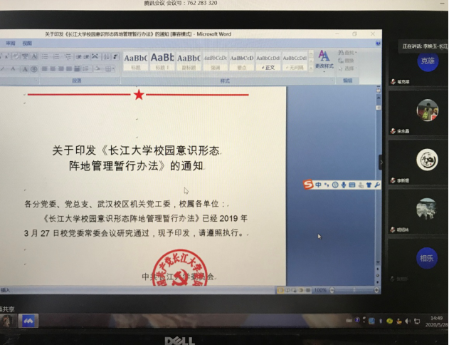 (通讯员 时 晓)5月28日下午2:30,学院分党委通过“腾讯会议”在线召开了中心组理论学习,学习活动由分党委书记李焕玉主持。学习会上,李焕玉书记带领中心组成员认真学习了《中共长江大学委员会意识形态工作责任制实施细则》、《长江大学校园意识形态阵地管理暂行办法》等文件,通报了拟发展党员情况、全面从严治党检查情况和示范党组织、示范党支部的申报情况。学习后,中心组成员开展了集中交流讨论。大家一致认为:意识形态斗争是一场寸土必争、不能退让的斗争,党员干部必须清醒认识意识形态领域出现的新变化以及斗争的新特点,切实绷紧政治弦,把维护核心、坚定信心、凝聚人心的工作做扎实,当好意识形态领域的排头兵。