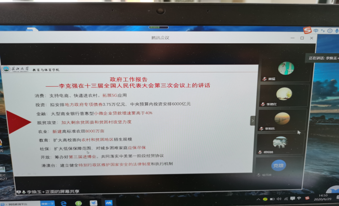 (通讯员 时晓)6月29日下午2:30,学院分党委通过“腾讯会议”在线召开了中心组理论学习,学习活动由分党委书记李焕玉主持。学习会上,李焕玉书记带领中心组成员认真学习了《习近平参加十三届全国人大三次会议湖北代表团审议时的重要讲话精神》、《2020年政府工作报告》、《湖北省委办公厅、省政府办公厅印发关于进一步做好新冠肺炎疫情常态化科学精准防控工作的实施意见》、 教育部等八部门印发《关于加快构建高校思想政治工作体系的意见》、教育部关于印发《高等学校课程思政建设指导纲要》的通知、新时代高校教师职业行为十项准则等文件。学习后,中心组成员针对《关于加快构建高校思想政治工作体系的意见》开展了集中交流讨论。大家一致认为:《关于加快构建高校思想政治工作体系的意见》深入贯彻习近平新时代中国特色社会主义思想,是对习近平总书记关于教育的重要论述,尤其是全国高校思想政治工作会议、全国教育大会、学校思想政治理论课教师座谈会精神的系统体现,对学校推动思想政治工作创新发展具有重大和深远意义。《意见》具有很强的指导性、针对性和可操作性,我们要以《意见》为遵循,在巩固好学院良好思想政治工作基础上,突出特色,深抓实效,实现思想政治工作体系与人才培养体系的有机统一。