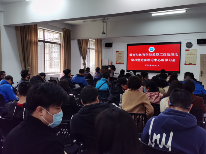 3月17日下午,教体学院在5教203召开3月份党委理论中心组学习暨全体教职工政治理论学习会。全体党委委员参与了本次学习,学习活动由分党委书记高明成主持。