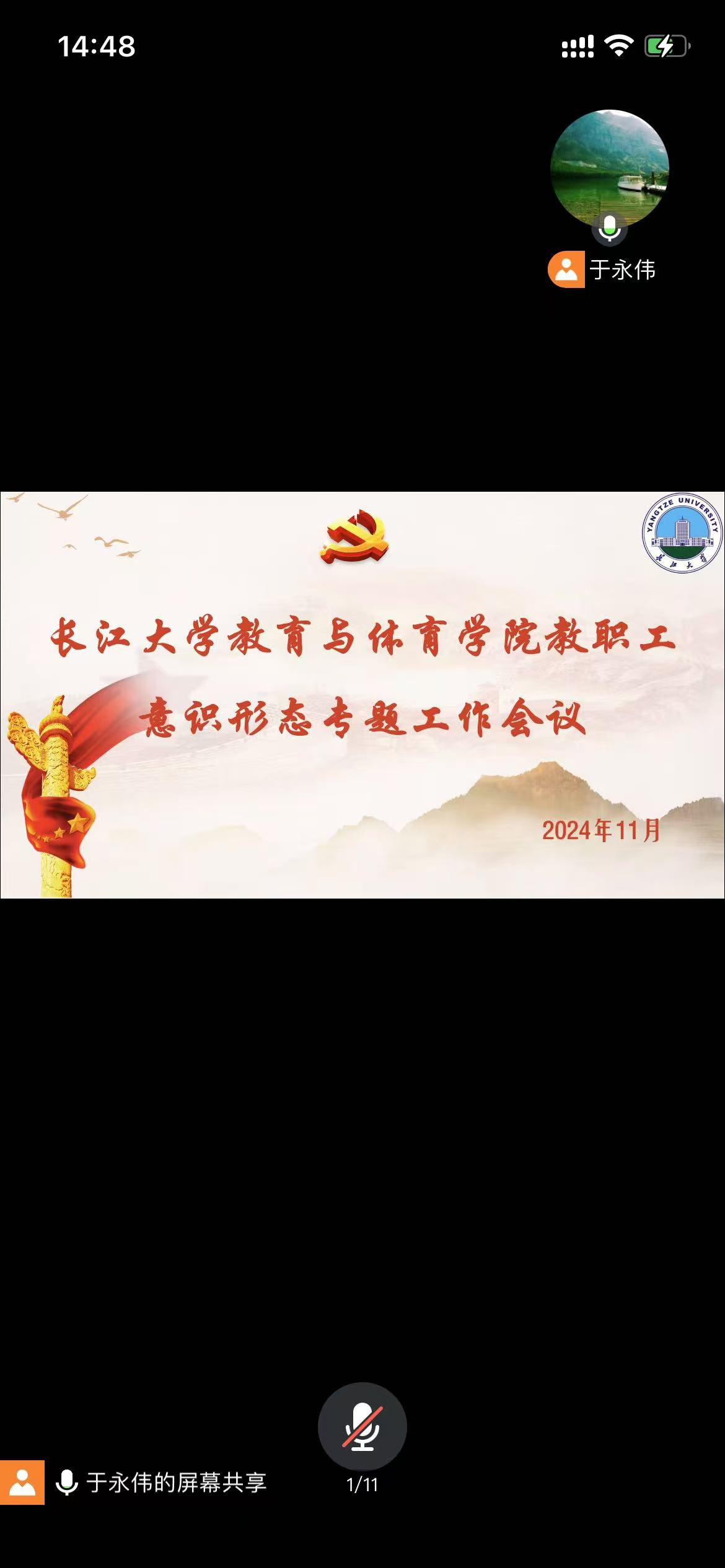 【通讯员 邓怡乐】2024年11月28日下午,我院开展了十一月份教职工政治理论学习及意识形态专题工作会议。此次会议采取线上形式,由我院党委书记于永伟主持,院领导班子及全体教职工参与。