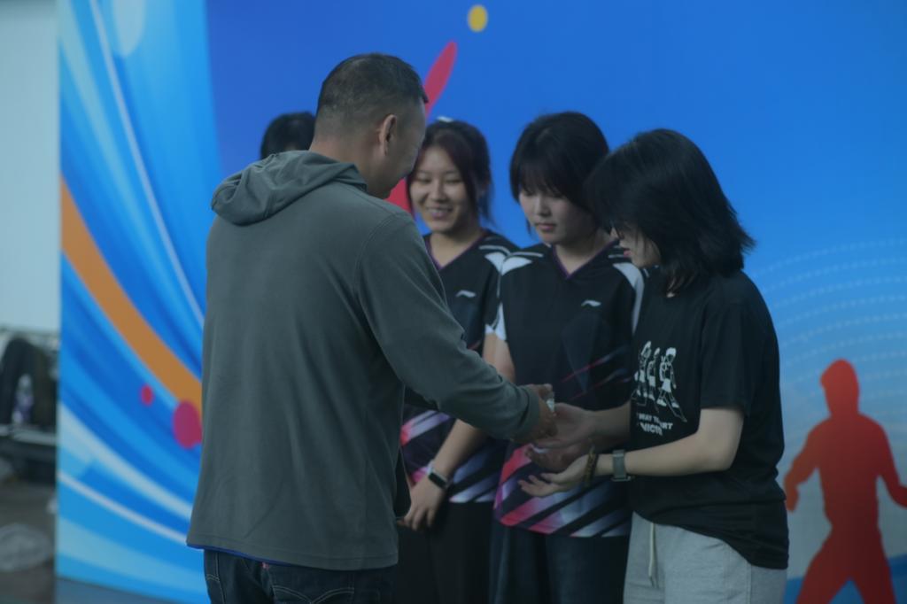 赛后长江大学乒乓球协会指导老师朱洪生、校乒乓球队主教练曹然老师为获奖单位颁发奖杯奖牌并合影留念。