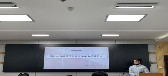 首先由来自体育教育训练学专业的陈仁贝同学,她就“高校体育教师信息化教学能力提升研究”做了专题报告。她详细讲解其选题目的,从高校体育教师信息化教学能力的内涵、信息化教学能力提高的必要性、信息化教学能力存在的问题、信息化教学能力提升的三大策略四个部分进行详细论述汇报。