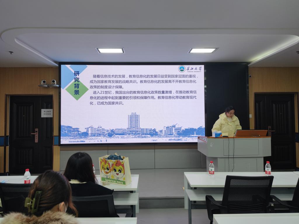 窦莹同学以“新世纪以来我国教育信息化政策文本分析研究”为题进行了本次汇报。窦莹从研究背景、研究意义、研究内容、研究方法、初期成果五个方面详细解读了教育信息化,并采用文献研究法、政策文献计量法以及PMC指数模型等研究方法进行了量化分析和评价。该汇报使在场的同学对我国教育信息化有了更加深刻的理解。