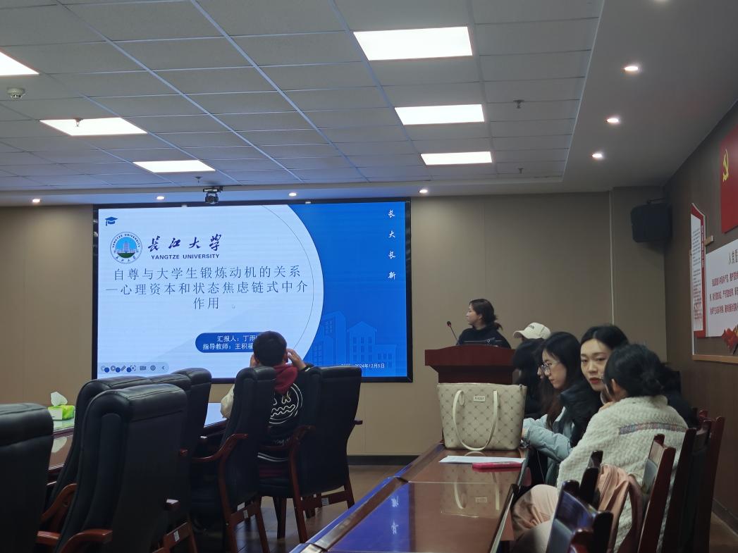 丁雨晴汇报的主题是《自尊与大学生锻炼动机的关系一心理资本和状态焦虑链式中介作用》,她以大学教育的普及,社会竞争日益激烈,大学生面对学业、职业和人际关系等多重压力为研究背景,列举了相关数据,提出了自尊是否是影响大学生产生锻炼动机的重要变量等假设,并利用调查问卷法,研究自尊与大学生锻炼动机的关系。