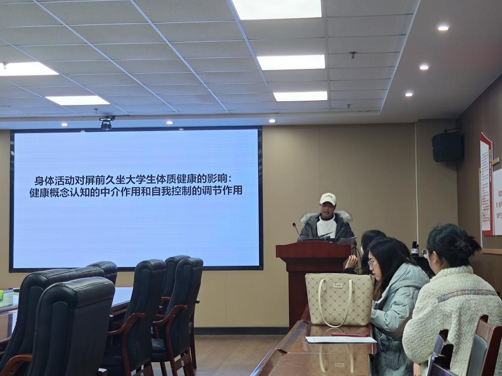 饶登汇报的主题是《身体活动对屏前久坐大学生体质健康的影响:健康概念认知的中介作用和自我控制的调节作用》,他指出,科技和电子设备的不断发展,大学生久坐行为呈上升趋势,严重影响大学生的身心健康,并提出了在体质健康、身体活动和健康概念方面,屏前久坐显著低于非屏前久坐大学生的假设,利用文献资料法,对两所综合性大学的学生进行问卷的发布,对其收集到的数据结果进行统计与分析,为改善屏前久坐大学生身心健康提供参考依据。
