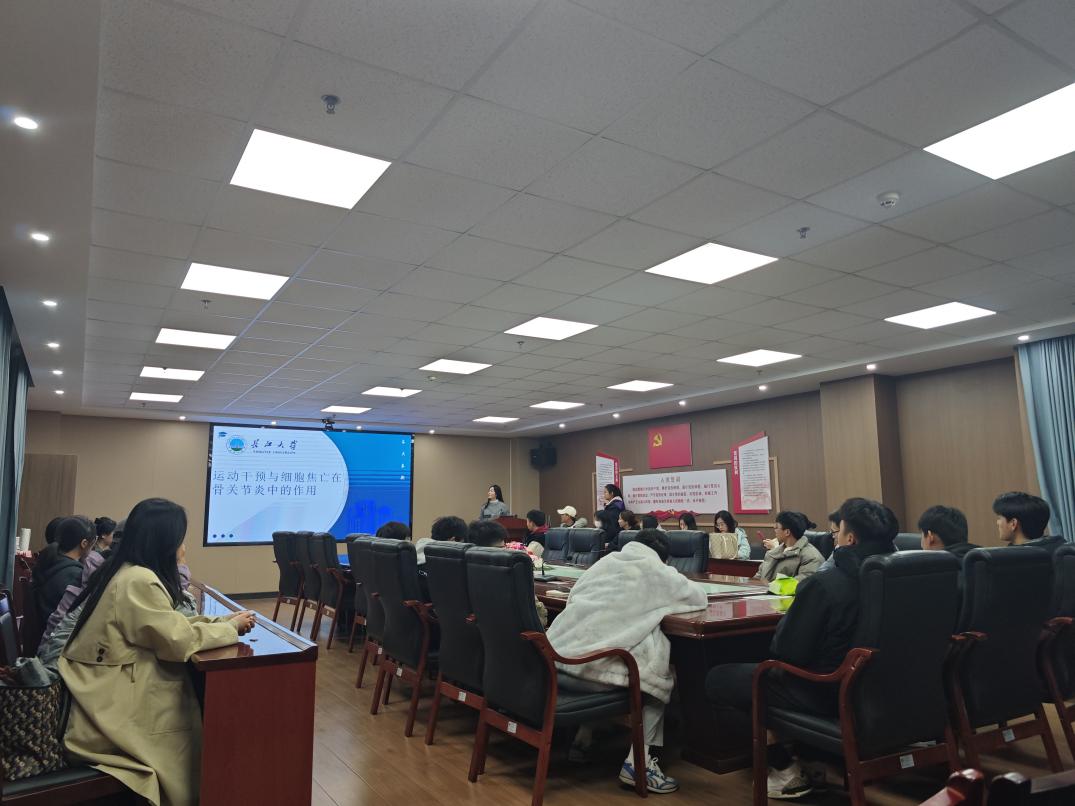 首先进行汇报的是王秋月,她汇报的主题是《运动干预与细胞焦亡在骨关节炎中的作用》,她指出,骨关节炎已成为全球范围内重大的公共卫生问题,并介绍细胞焦亡引发的炎症反应在骨关节炎的防治中发挥着重要的作用,该篇论文已经在核心期刊上发表。