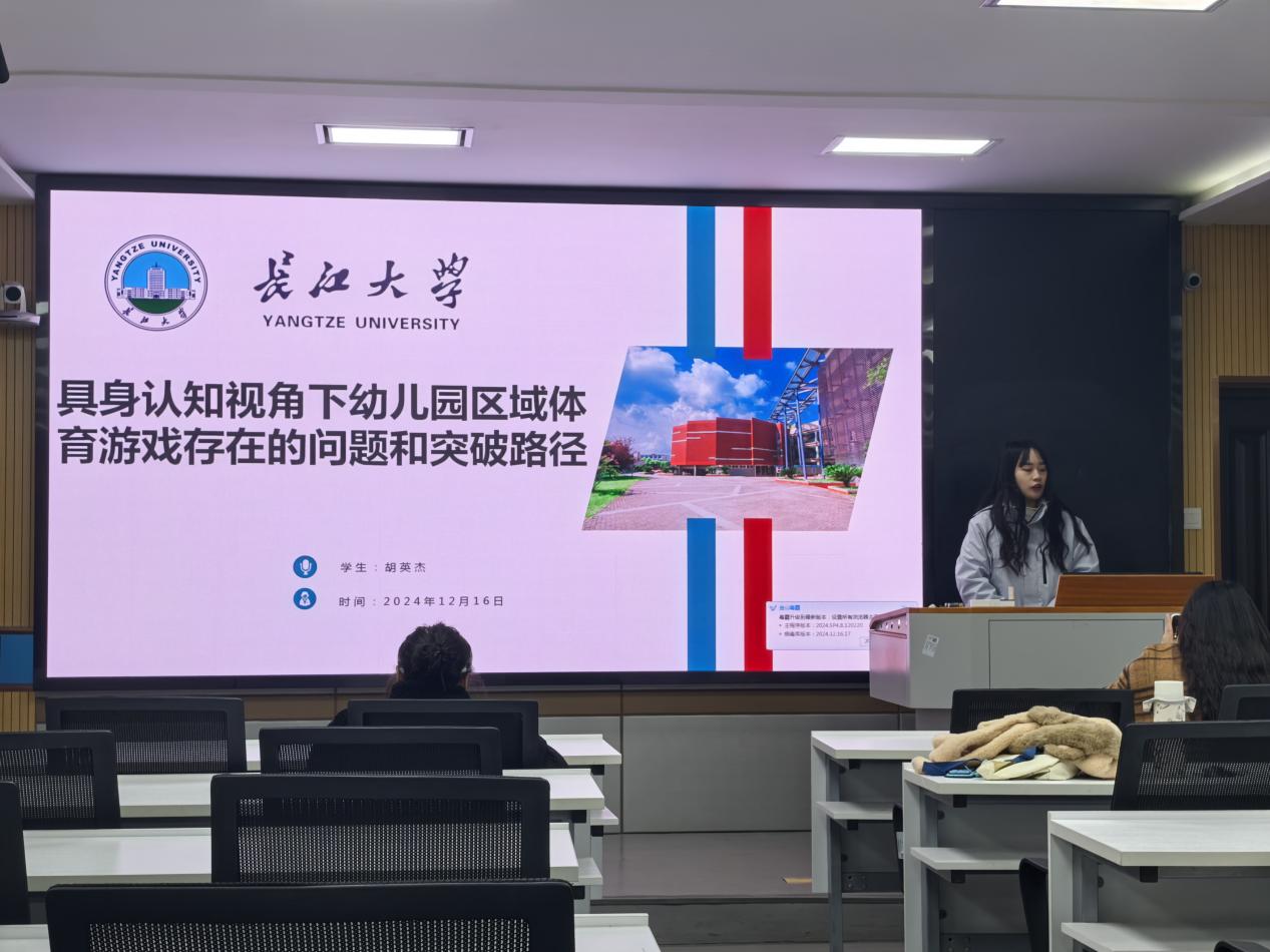 胡英杰汇报的主题是《具身认知视角下幼儿园区域体育游戏存在的问题和突破路径》,她向同学们阐明了具身认知的概念,强调其在认知形成过程中的不可或缺性,并指出具身认知理论十分注重幼儿的自主性与能动性,较为系统的分析了幼儿园区域体育游戏存在的问题和突破路径,并重点指出科学地选择幼儿园区域体育游戏材料的重要意义,为学前教育研究中针对幼儿园体育游戏的规划和完善提供了可行性建议。