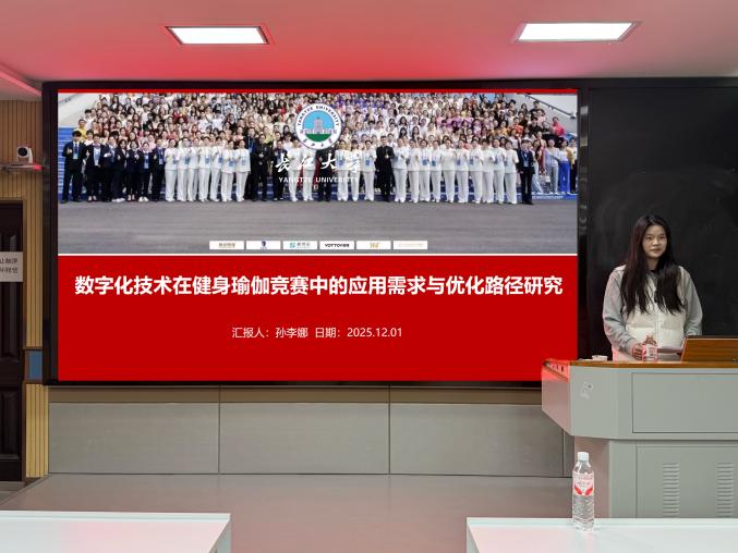 首先进行汇报的是孙李娜,其汇报的主题是《数字化技术在健身瑜伽竞赛中的应用需求与优化路径研究》,她围绕国家体育数字化战略背景,分析了健身瑜伽竞赛在评分、训练与管理方面对人工依赖过高的问题,指出当前数字化技术如VR直播、AI评分等已初步应用,但仍面临技术信任、成本高昂、数字素养不足等障碍;研究通过问卷调查明确了执裁公平透明、数据驱动训练与赛事传播互动三大核心需求,并提出通过推广电子评分系统、开发智能训练平台、构建一体化传播矩阵等路径系统推进数字化转型升级。
