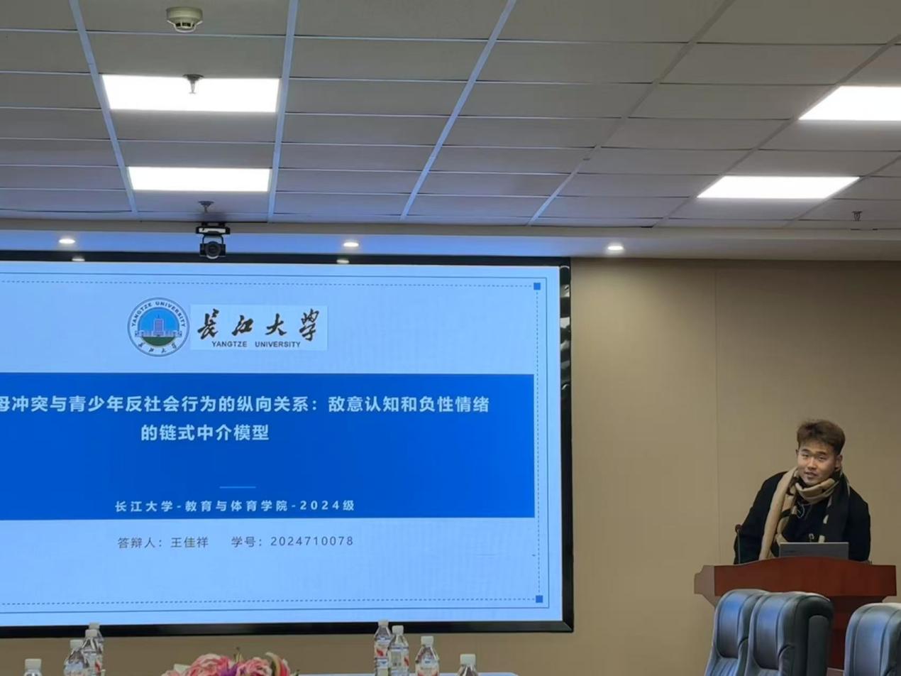 2024级研究生王佳祥同学围绕《父母冲突与青少年反社会行为的纵向关系:敌意认知和负性情绪的链式中介模型》开展专题汇报。该研究通过纵向追踪调查与M工程项目数据分析,系统考察父母冲突与青少年反社会行为之间的纵向关联机制,科学验证了"父母冲突→敌意认知→负性情绪→反社会行为"的链式中介作用路径,为青少年行为干预工作提供了重要实证依据。