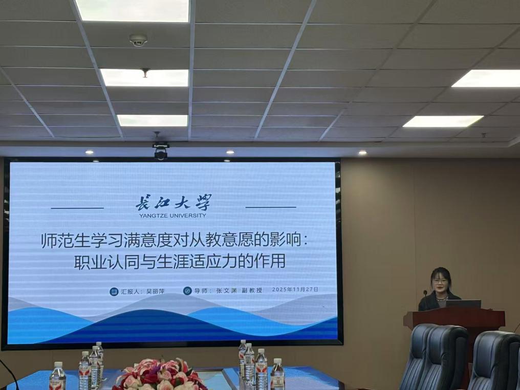 2024级研究生吴丽萍同学围绕《师范生学习满意度对从教意愿的影响:职业认同与生涯适应力的作用》作了学术汇报。该研究基于社会认知职业理论框架,通过量表测评与数据分析,系统构建了"学习满意度→职业认同→生涯适应力→从教意愿"的中介作用模型,为高等院校深化师范生培养机制改革、破解师资队伍建设瓶颈提供了有益参考。