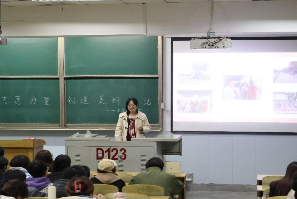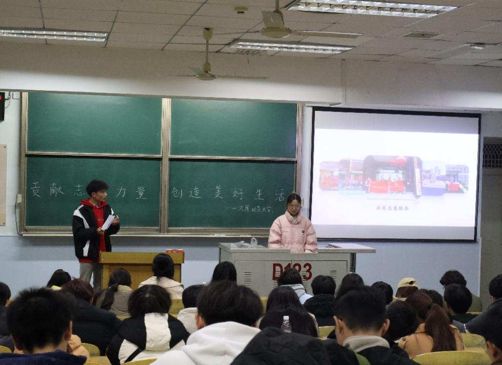 接下来,由志愿者代表覃乐乐、徐雨馨发言,分享她们在志愿服务中的亲身经历与深刻感悟。她们采用PPT的方式,呈现出过往志愿服务的丰硕成果,让在场的每一个人都深切感受到了志愿服务的魅力与价值。她们向同学们分享自己的服务经验与收获,强调坚持与积累在志愿服务中的重要性,并动员大家积极参与其中,为社会奉献爱心,同时结交志同道合的朋友,共同进步。